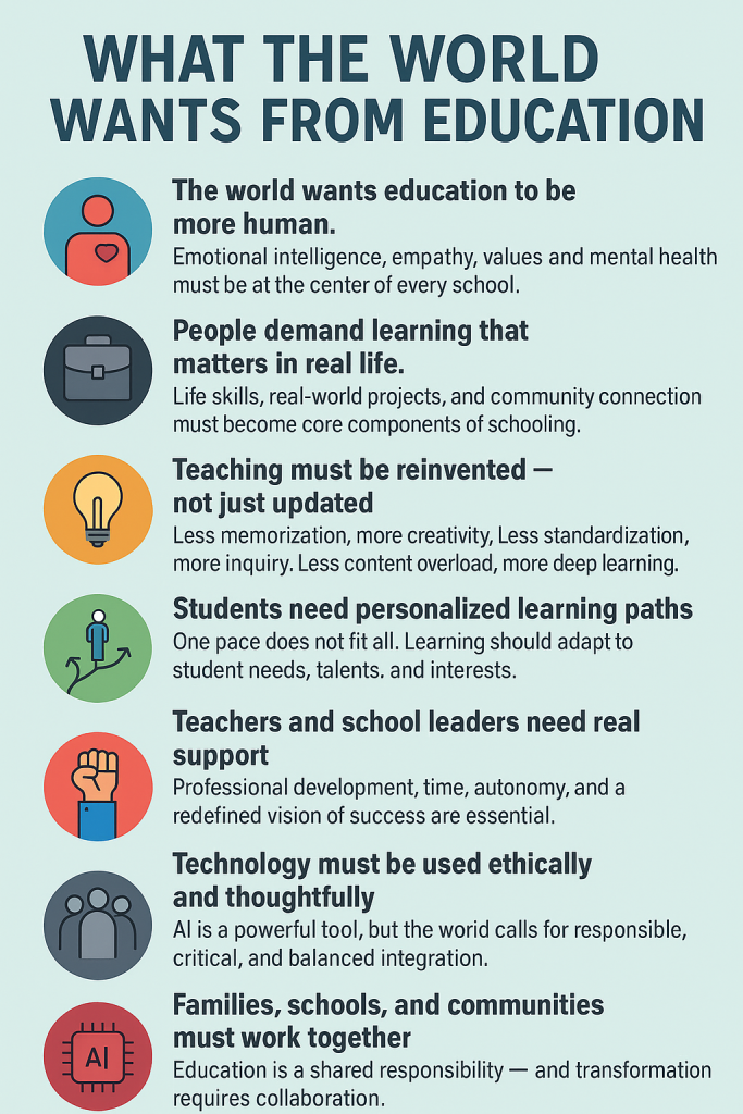 We asked, you answered. Through our global survey, people from many countries, cultures, and school systems told us what they believe must change in education. These are the main insights: